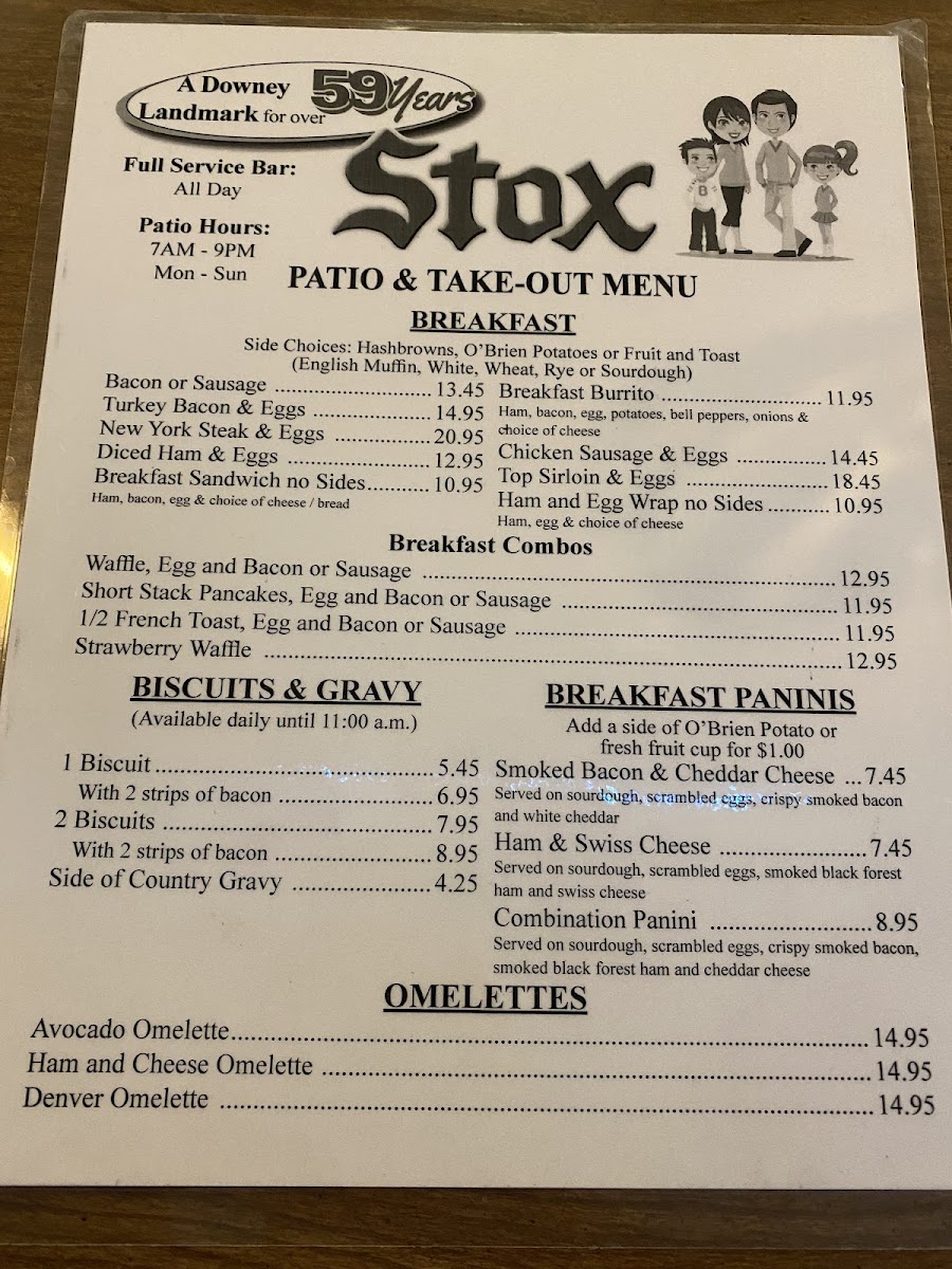 Stox Restaurant Bakery & Bar offers a straightforward, comforting menu that blends classic American and breakfast favorites with casual bites and familiar beverages. It’s the kind of place where you can start your day with a freshly brewed coffee and a hearty plate like Turkey Bacon & Eggs or Eggs Benedict, or settle in for lunch with home-style options such as Prime Rib & Eggs or a satisfying Hamburger.
